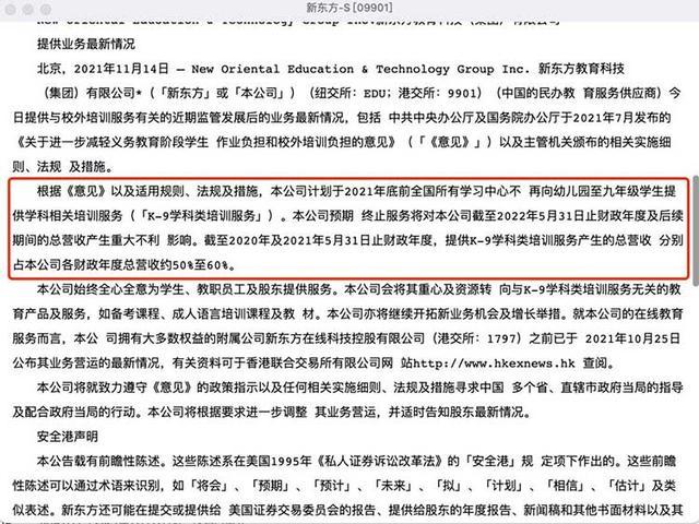 11月15日上午,新东方-S在港交所发布公告,计划于2021年底前,全国所有学习中心不再向幼儿园至九年级学生提供学科相关培训服务。