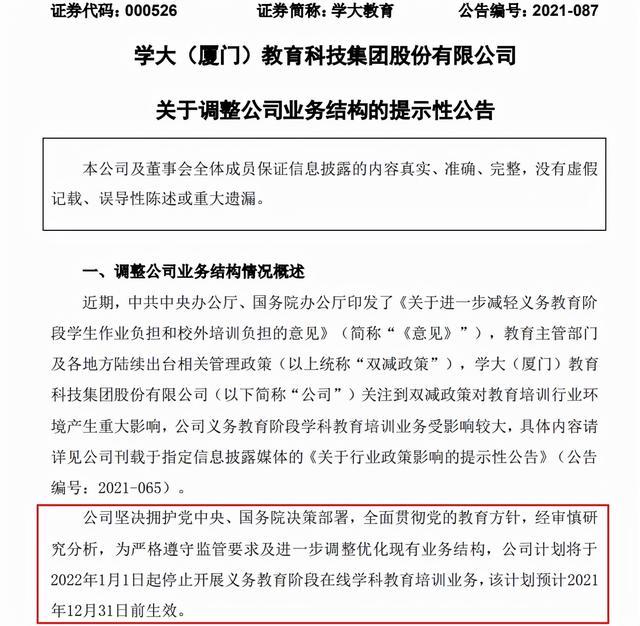学大教育在公告中表示,学大(厦门)教育科技集团股份有限公司(以下简称“公司”)关注到双减政策对教育培训行业环境产生重大影响,公司义务教育阶段学科教育培训业务受影响较大。经审慎研究分析,为严格遵守监管要求及进一步调整优化现有业务结构,学大教育计划将于2022年1月1日起停止开展义务教育阶段在线学科教育培训业务,该计划预计2021年12月31日前生效。