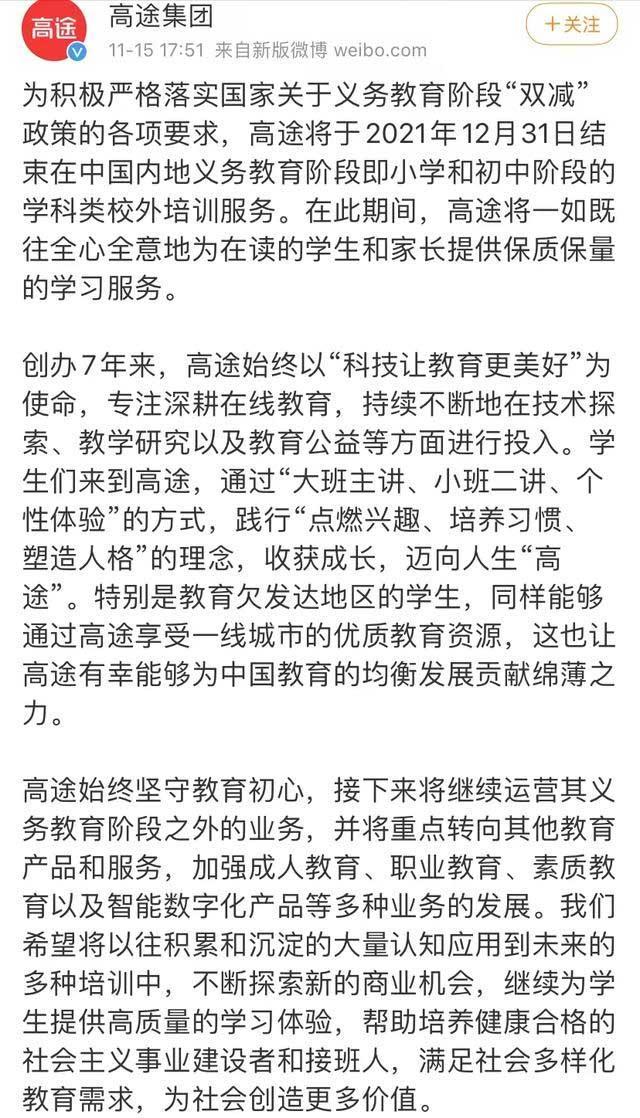 11月15日晚间,高途集团在其官方微博上表示,为积极严格落实国家关于义务教育阶段“双减”政策的各项要求,高途将于2021年12月31日结束在中国内地义务教育阶段即小学和初中阶段的学科类校外培训服务。在此期间,高途将一如既往全心全意地为在读的学生和家长提供保质保量的学习服务。