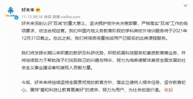 据好未来官方微博:好未来深刻认识“双减”的重大意义,坚决拥护党中央决策部署,严格落实“双减”工作的各项要求,依法合规经营。中国内地义务教育阶段的学科类校外培训服务将于2021年12月31日截止。在此之前,将保质保量完成用户已报名的此类课程服务。